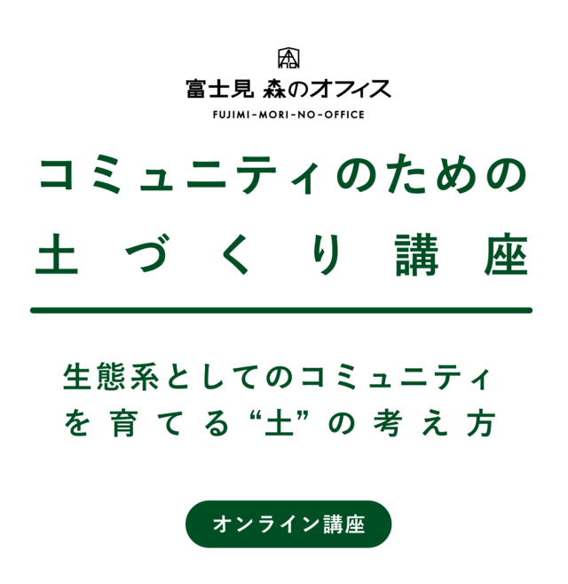 これまでの森のオフィスでの運営経験を元に、コワーキングスペース、コミュニティスペース、イノベーションスペースなどの施設立ち上げと運営、また人と人の関係性を重点に置いたリアルなコミュニティの育成に必要な、運営の軸となるマインドセットをお伝えし、一緒に深めていく講座です。 全5回 各回90〜120分 受講者には森のオフィス10周年記念書籍『十草十載』をお送りします。 SEASON 02(5月開催回) 1. 4月30日(木) リアルorオンライン参加 2. 5月14日(木) オンライン参加 3. 5月21日(木) オンライン参加 4. 5月28日(木) オンライン参加 5. 6月4日(木) オンライン参加 ※SEASON01、02は共に同じ内容です。どちらかをお選びください。 講座詳細はこちらをご確認ください: https://www.morino-office.com/webinar